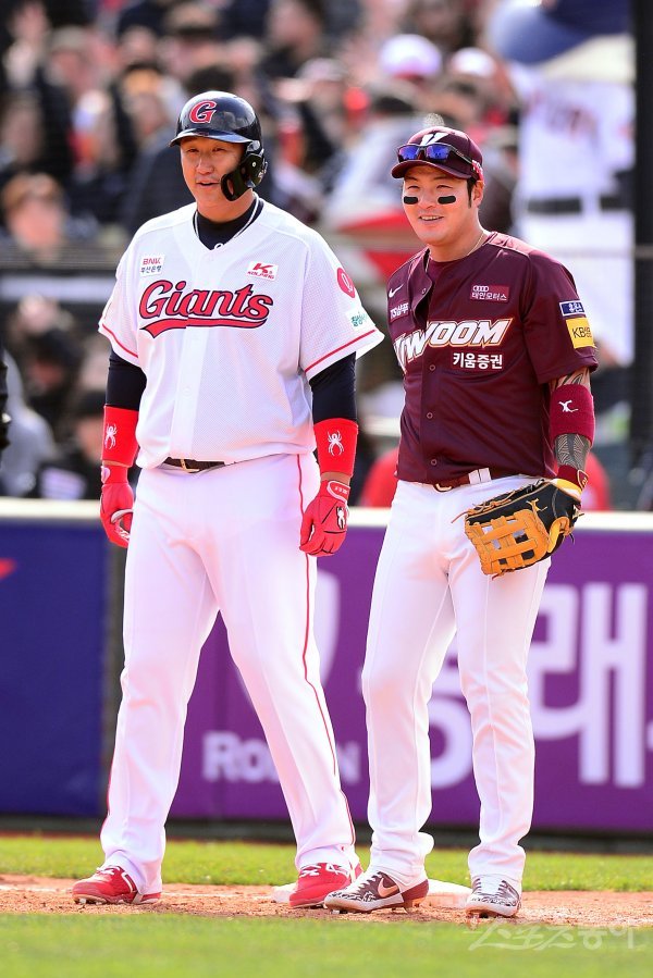 23일 부산 사직야구장에서 ‘2019 신한은행 MY CAR KBO리그’ 개막전 키움히어로즈와 롯데자이언츠 경기가 열렸다. 4회말 무사 롯데 이대호가 볼넷으로 출루한 후 키움 박병호가 이야기 하고 있다. 부산 | 김종원 기자 won@donga.com