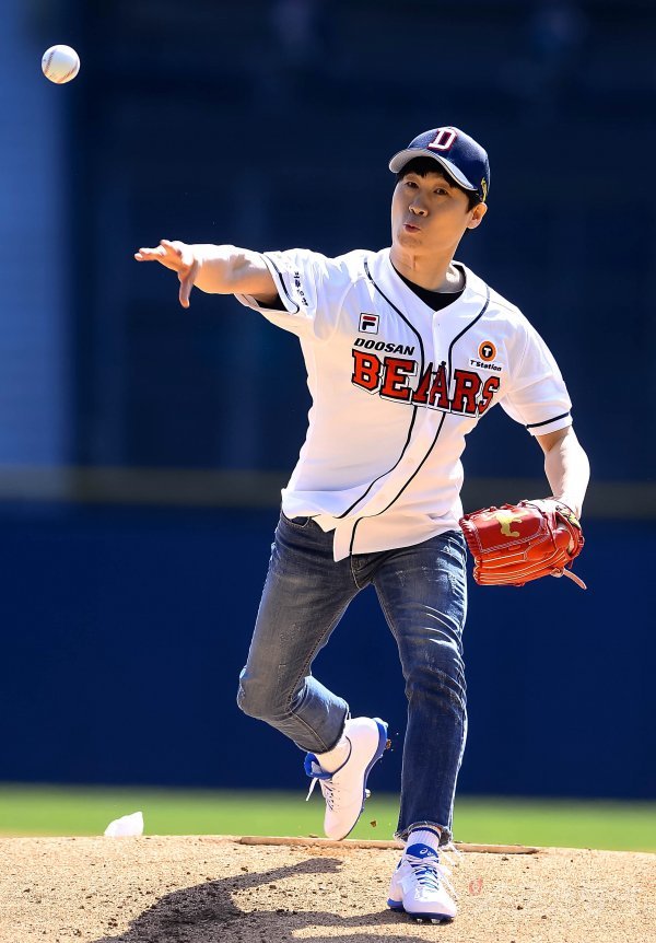 24일 서울 잠실야구장에서 ‘2019 신한은행 MY CAR KBO리그’ 한화이글스와 두산베어스의 경기가 열렸다. 배우 진선규가 힘차게 시구를 하고 있다.