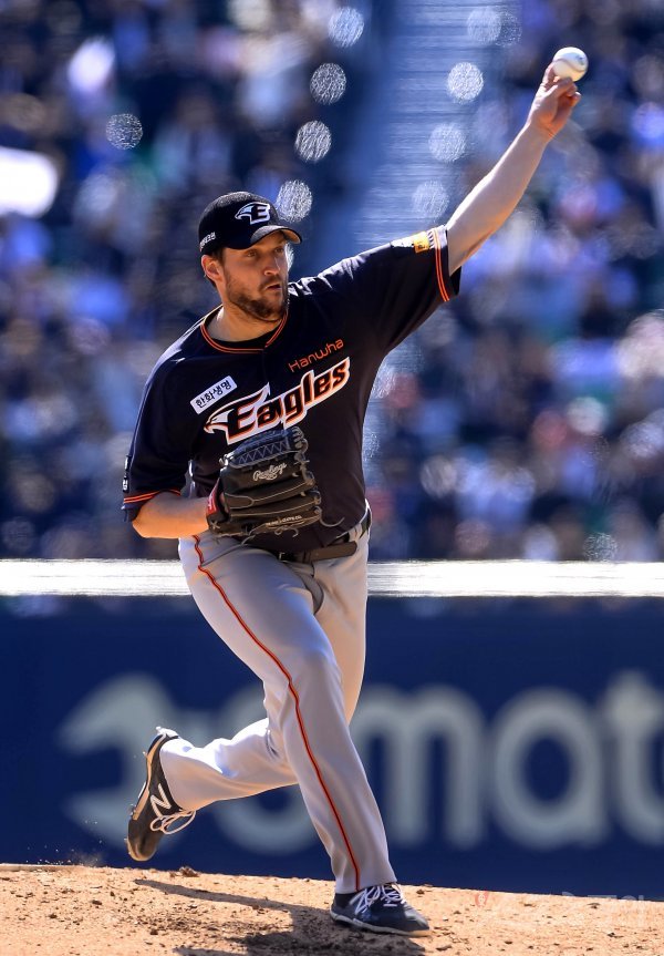 24일 서울 잠실야구장에서 ‘2019 신한은행 MY CAR KBO리그’ 한화이글스와 두산베어스의 경기가 열렸다. 한화 선발 채드벨이 힘차게 공을 던지고 있다.