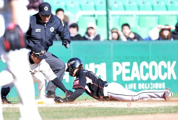 6회초 1사 1, 2루에서 kt 장성우의 삼진 아웃 때 2루 주자 심우준이 3루 도루에 성공하고 있다.