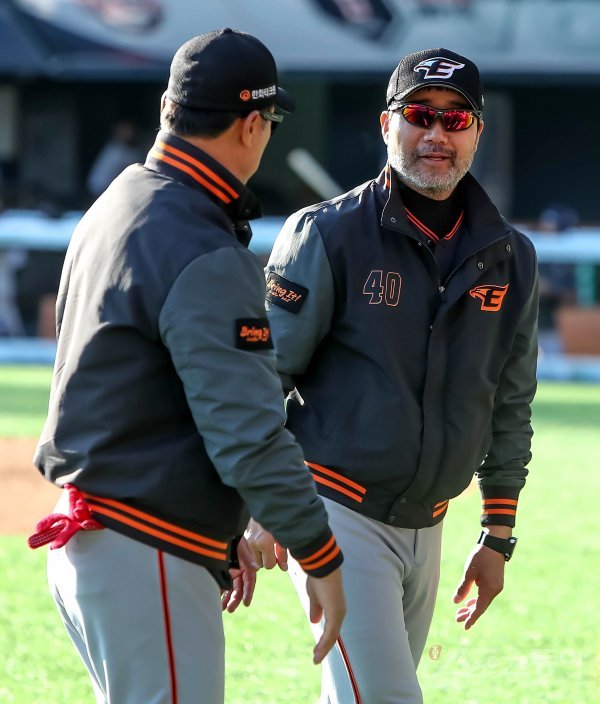경기 후 한용덕 감독이 미소를 지으며 장종훈 코치(왼쪽)와 대화를 나누고 있다.