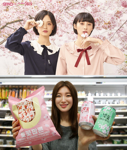 이랜드 스파오 ‘카드캡터 체리’ 협업 제품(위쪽)과 GS리테일 ‘유어스 벚꽃 팝콘과 음료’. 완연한 봄 시즌을 맞아 유통업계 전반에 벚꽃 마케팅이 한창이다. 사진제공|이랜드·GS리테일