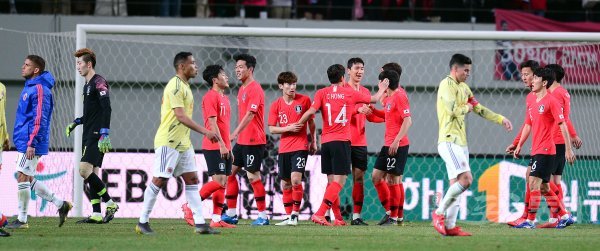 26일 서울월드컵경기장에서 열린 한국 축구대표팀과 콜롬비아의 평가전에서 2-1 승리를 거둔 한국 선수들이 하이파이브하고 있다.
