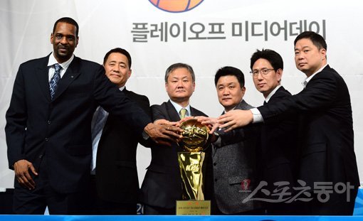 21일 서울 청담 리베라호텔에서 ‘2018-2019 SKT 5GX 프로농구’ 플레이오프 미디어데이가 열렸다. KCC 스테이스 오그먼, 오리온 추일승, 모비스 유재학, 전자랜드 유도훈, KT 서동철, LG 현주엽 감독(왼쪽부터)이 우승 트로피를 앞에 두고 포즈를 취하고 있다. 김민성 기자 marineboy@donga.com