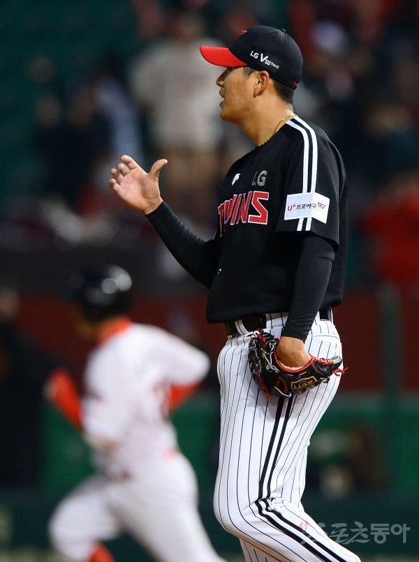 LG 선발 배재준이 3회말 1사 SK 이재원에게 솔로홈런을 허용한 후 아쉬워하고 있다.