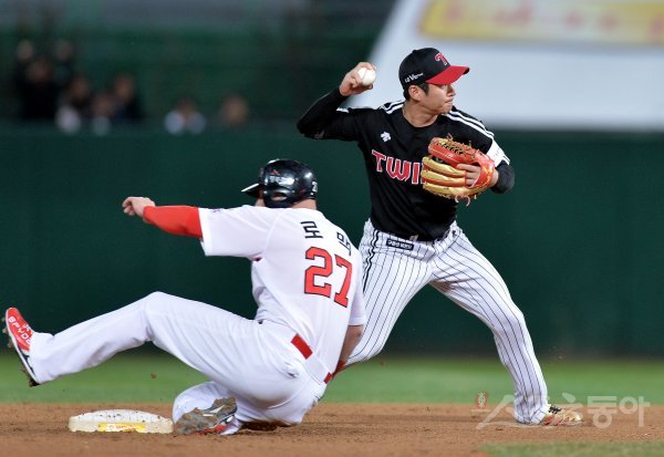 7회말 1사 1루에서 SK 이재원의 내야 땅볼 때 LG 오지환이 2루에서 로맥을 포스 아웃 시킨 뒤 1루로 송구하고 있다.