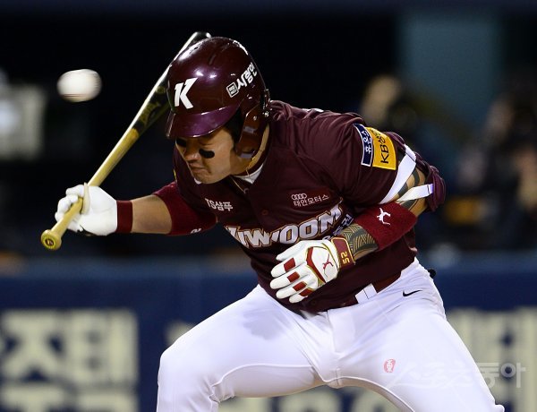 키움 박병호가 3회초 1사 1루에서 두산 선발 이영하의 공에 어깨 부위를 맞고 있다.