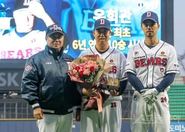 경기를 앞두고 두산 유희관이 구단 최초 6년 연속 10승 시상식에서 김태형 감독, 오재원(오른쪽)과 포토타임을 갖고 있다.