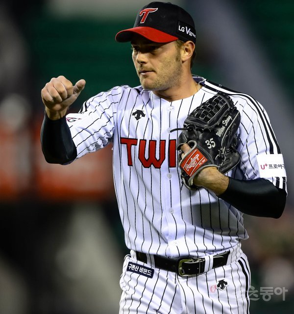 29일 서울 잠실야구장에서 ‘2019 신한은행 MY CAR KBO리그’ 롯데자이언츠와 LG트윈스의 경기가 열렸다. LG 선발 윌슨이 2회초를 무실점으로 막은 후 포수 유강남을 향해 엄지손가락을 내밀고 있다.