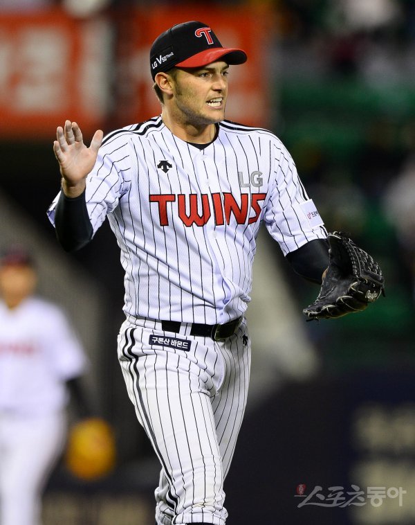 29일 서울 잠실야구장에서 ‘2019 신한은행 MY CAR KBO리그’ 롯데자이언츠와 LG트윈스의 경기가 열렸다. LG 선발 윌슨이 6회초 2사 1,2루에서 롯데 이대호를 내야 땅볼로 처리한 후 환호하고 있다.