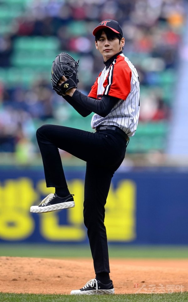 31일 서울 잠실야구장에서 ‘2019 신한은행 MY CAR KBO리그’ 롯데자이언츠와 LG트윈스의 경기가 열렸다. 워너원 출신 옹성우가 시구 행사에서 포즈를 취하고 있다.