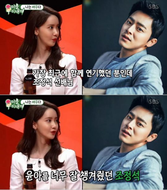 윤아는 지난 3월 31일 오후 방송된 SBS 예능프로그램 ‘미운 우리 새끼’에서 “연기할 때 호흡이 가장 잘 맞았던 배우가 있느냐”고 묻자 “가장 최근 작품을 같이 한 조정석”이라고 답했다.