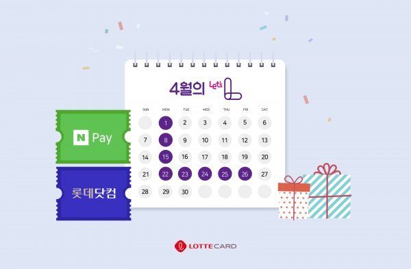 롯데카드가 ‘Let’s L’TOUCH(렛츠 엘 터치) 4월 이벤트(사진)를 진행한다. 4월 달력에 알파벳 L이 그려지는 매주 월요일과 마지막 주에 롯데카드 라이프 앱 터치 서비스에서 이용 가능하다. 매주 월요일 ‘다같이 Let’s L 네이버페이’ 혜택을 터치 완료하면 네이버페이를 통해 4만 원 이상 결제 시 2000원을 1일 1회, 총 2회 할인해준다. 또 마지막 주 화~금요일에 ‘다같이 Let’s L 롯데닷컴’ 혜택을 터치완료하면 롯데닷컴에서 4만 원 이상 결제 시 2000원을 1일 1회, 총 2회 할인해준다.