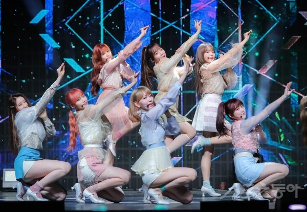 걸그룹 아이즈원(IZ*ONE)이 1일 서울 용산구 한남동 블루스퀘어에서 열린 두 번째 미니앨범 ‘하트아이즈(HEART*IZ)’ 발매 기념 쇼케이스에서 열정적인 무대를 펼치고 있다.