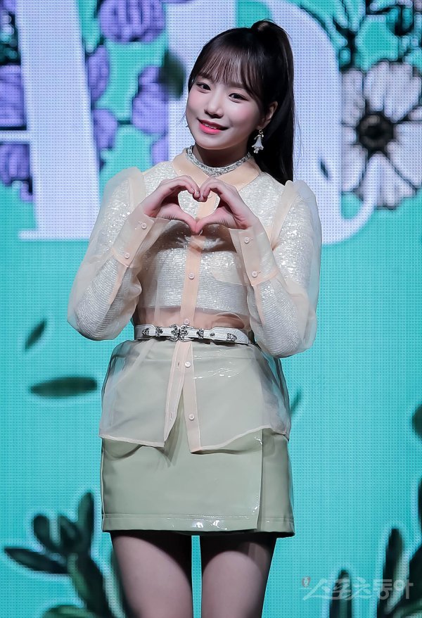 걸그룹 아이즈원(IZ*ONE)의 조유리가 1일 서울 용산구 한남동 블루스퀘어에서 열린 두 번째 미니앨범 ‘하트아이즈(HEART*IZ)’ 발매 기념 쇼케이스에서 포토타임을 갖고 있다.