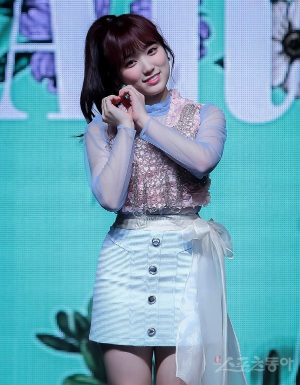 걸그룹 아이즈원(IZ*ONE)의 야부키 나코가 1일 서울 용산구 한남동 블루스퀘어에서 열린 두 번째 미니앨범 ‘하트아이즈(HEART*IZ)’ 발매 기념 쇼케이스에서 포토타임을 갖고 있다.
