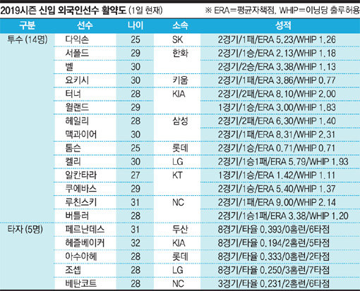 다만 개막 8경기를 통해 밑그림이 드러난 부문들도 엿보인다. 그중 하나는 올해 처음 한국무대를 밟은 신입 외국인선수들의 활약상이다. 투수 14명, 타자 5명으로 모두 19명이다. 시기적으로 이른 만큼 제한적 평가만 가능한데, 적어도 ‘효자 외국인선수’가 될 만한 후보들은 벌써부터 눈에 띈다.