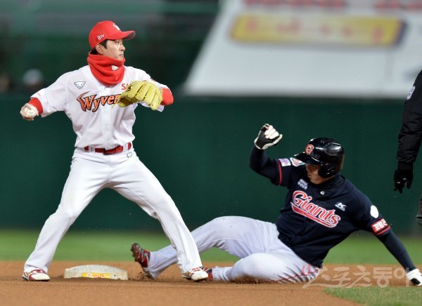 6회초 1사 1루에서 롯데 아수아헤의 내야 땅볼 때 SK 김성현이 1루 주자 한동희를 2루에서 포스 아웃 시키고 있다.
