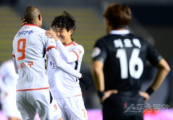전반 제주 권순형이 선취골을 넣은 찌아구와 기쁨을 나누고 있다.
