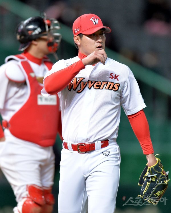 7회초 2사 1, 3루에서 SK 하재훈이 교체되어 마운드를 내려오고 있다.