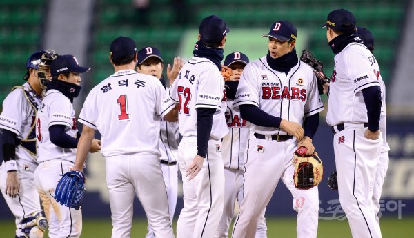 5-1 승리를 거둔 두산 선수들이 하이파이브하고 있다.