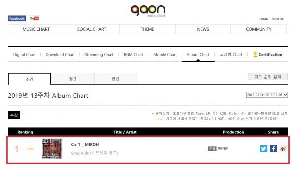 스트레이 키즈가 지난달 25일 발표한 미니 앨범 \'클레 원 : 미로(Clé 1 : MIROH)\'는 오늘(4일) 발표된 2019년 13주차(3월 24~30일) 가온 앨범 차트 1위에 올랐다.