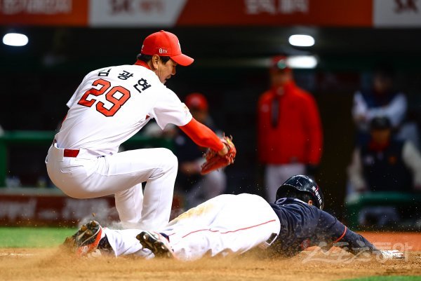 롯데 민병헌이 3회초 무사 2,3루에서 SK 선발 김광현의 폭투 때 홈으로 쇄도, 세이프되고 있다.