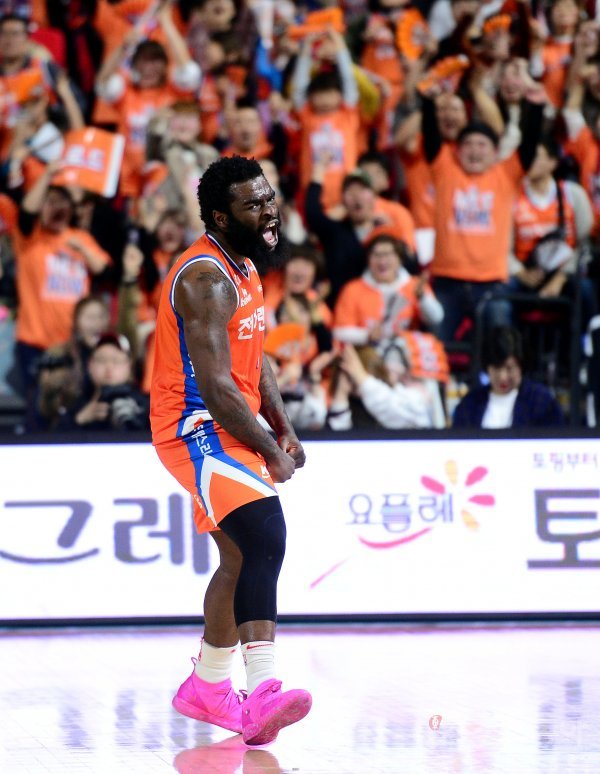 4일 인천 삼산월드체육관에서 열린 ‘2018-2019 SKT 5GX 프로농구’ 인천 전자랜드와 창원 LG의 4강 플레이오프 1차전 경기에서 전자랜드 팟츠가 공격을 성공한 뒤 포효하고 있다.