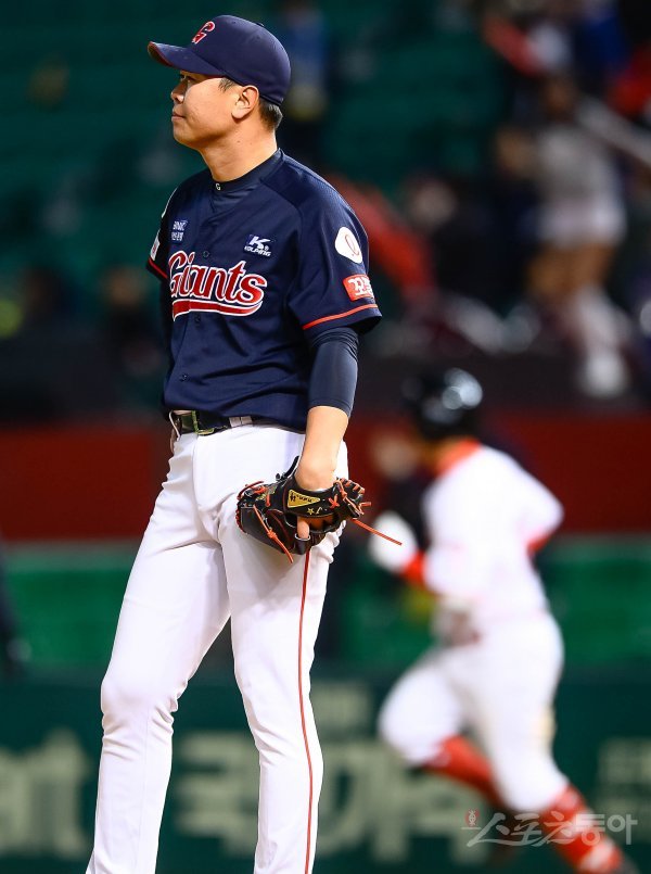 롯데 진명호가 7회말 2사 SK 이재원에게 동점 홈런을 허용한 후 아쉬워하고 있다.