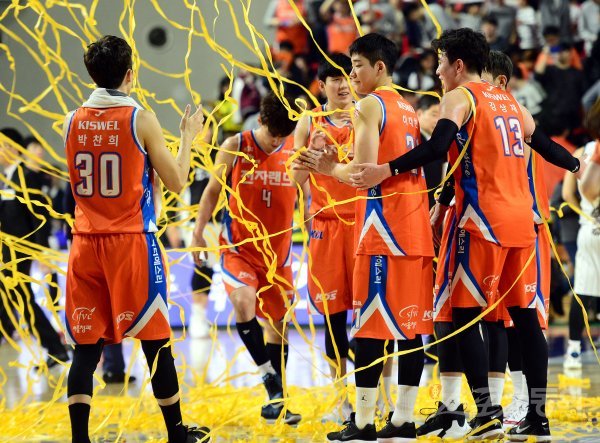 4일 인천 삼산월드체육관에서 열린 ‘2018-2019 SKT 5GX 프로농구’ 인천 전자랜드와 창원 LG의 4강 플레이오프 1차전 경기에서 전자랜드가 LG에 86-72로 승리한 뒤 선수들이 코트에서 기쁨을 나누고 있다.