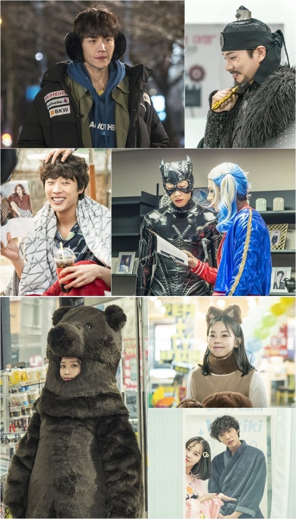 공개된 사진에서 배우들의 유쾌한 에너지와 뜨거운 열정이 느껴진다. 먼저 귀마개를 장착한 김선호의 모습이 눈길을 끈다. 추위 속에 촬영을 준비 중인 그의 눈빛이 사뭇 진지하다. 영화 ‘관상’의 이정재를 패러디해 빈틈없는 웃음을 선보인 이이경의 훈훈한 미소와 신현수의 해맑은 ‘멍뭉美’도 현장을 밝힌다. 특히 지난 방송에서 ‘할리퀸’과 ‘캣우먼’ 분장으로 폭소를 안긴 이이경, 신현수의 대본 열공 현장도 포착됐다. 뭉쳤다 하면 사고를 몰고 다니는 환장의 절친 ‘준기봉’으로 코믹 호흡을 자랑하는 두 사람의 활약에 기대가 더욱 쏠린다. 이어진 사진 속, 곰탈을 쓴 문가영의 달달한 눈 맞춤이 설렘을 자극하는가 하면 캣걸로 변신한 안소희의 모습도 사랑스럽다. 지난 방송에서 강렬한 첫 등장으로 하드캐리한 김예원과 신현수의 다정한 투샷도 시선을 강탈한다.