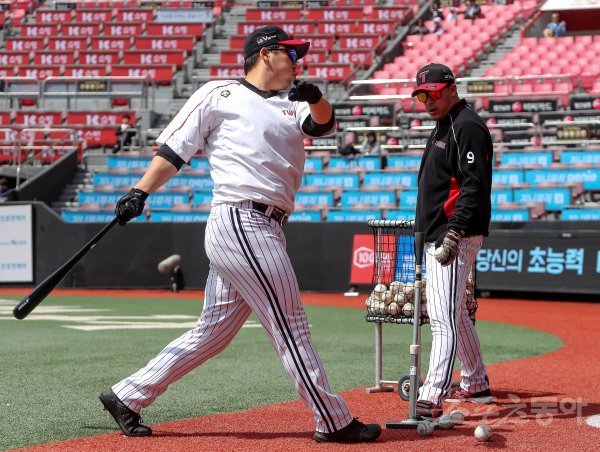 7일 경기도 수원 kt위즈파크에서 ‘2019 신한은행 MY CAR KBO리그’ LG트윈스와 kt위즈의 경기가 열린다. LG 김현수가 경기에 앞서 배팅 훈련을 하고 있다.