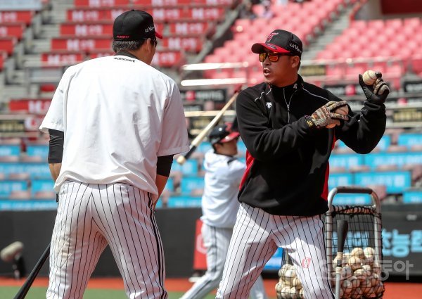 7일 경기도 수원 kt위즈파크에서 ‘2019 신한은행 MY CAR KBO리그’ LG트윈스와 kt위즈의 경기가 열린다. LG 이병규 코치가 김현수에게 타격에 대한 설명을 하고 있다.