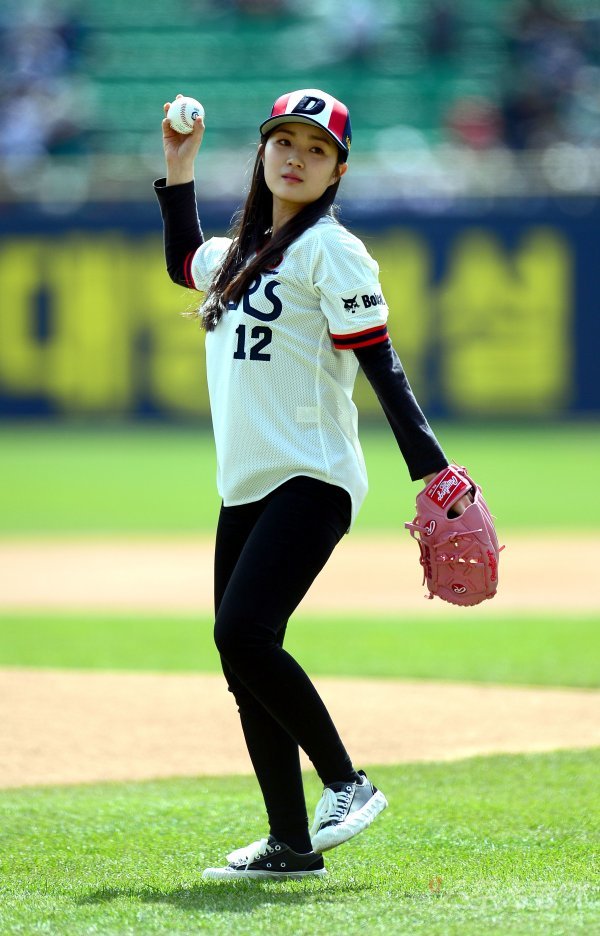 경기 전 탤런트 김혜윤이 시구를 하고 있다.