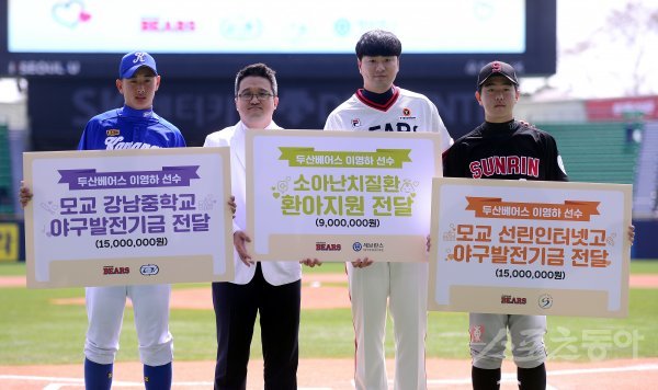 경기 전 두산 이영하의 불법스포츠도박 자진신고 포상금 사회공헌 전달식이 진행되고 있다.
