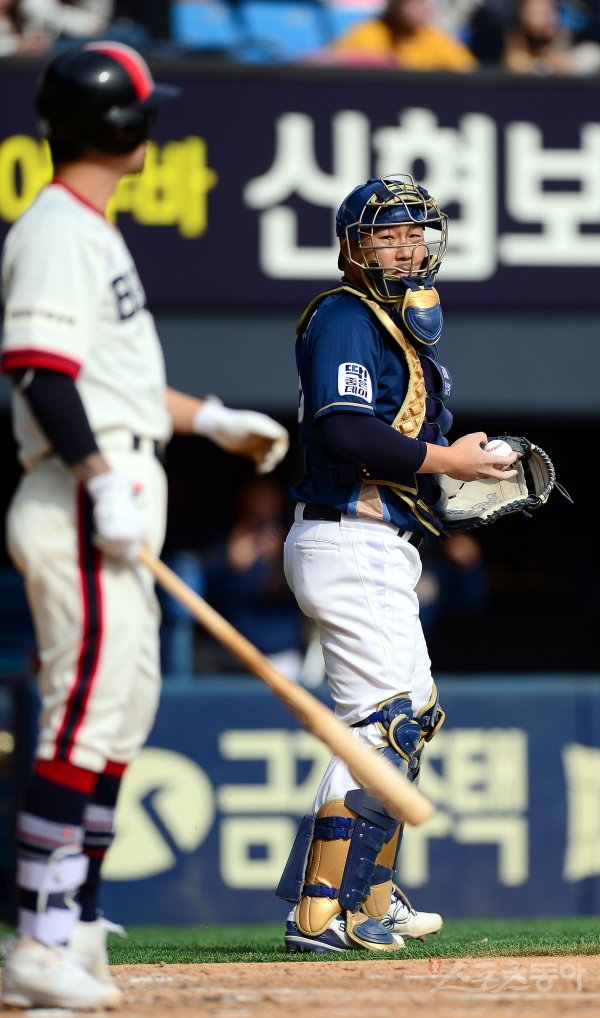6회말 2사 만루 상황에서 NC 양의지가 삼진 아웃을 당한 두산 오재원을 바라보고 있다.