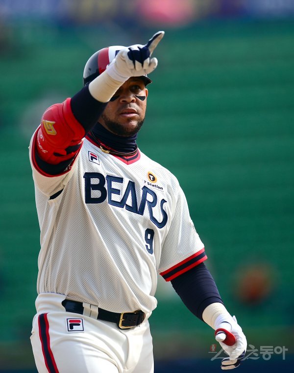 6회말 무사 2루 두산 페르난데스가 1타점 중전 안타를 치고 1루에서 기뻐하고 있다.