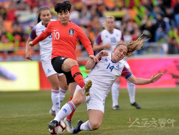 9일 강원도 춘천 송암스포츠타운 주경기장에서 열린 한국과 아이슬란드의 여자축구 A매치 평가전 경기에서 한국 이금민의 슛이 아이슬란드 수비수에 막히고 있다.