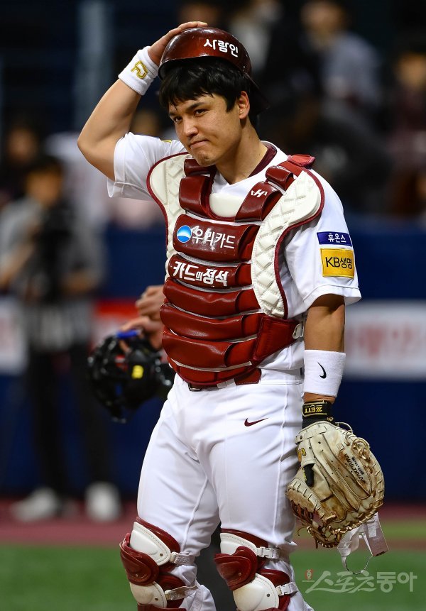 키움 박동원이 경기를 앞두고 kt 더그아웃을 향해 인사를 하고 있다.