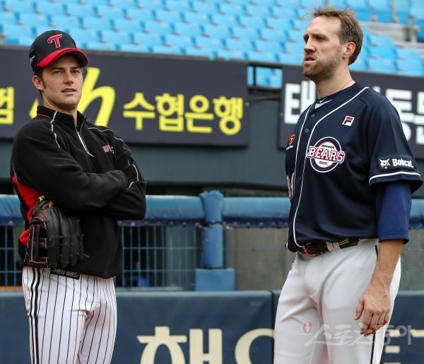14일 서울 잠실야구장에서 ‘2019 신한은행 MY CAR KBO리그’ 두산베어스와 LG트윈스의 경기가 열린다. 경기를 앞두고 LG 외국인 투수 윌슨과 두산 린드블럼(오른쪽)이 대화를 나누고 있다.