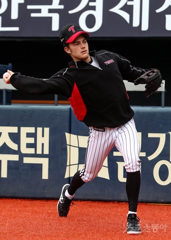 14일 서울 잠실야구장에서 ‘2019 신한은행 MY CAR KBO리그’ 두산베어스와 LG트윈스의 경기가 열린다. 경기를 앞두고 LG 외국인 투수 윌슨이 공을 던지고 있다.