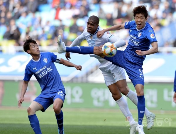 14일 경기도 수원월드컵경기장에서 열린 ‘하나원큐 K리그1 2019’ 수원 삼성과 대구 FC의 경기에서 수원 조성진과 대구 에드가가 공중볼을 다투고 있다.