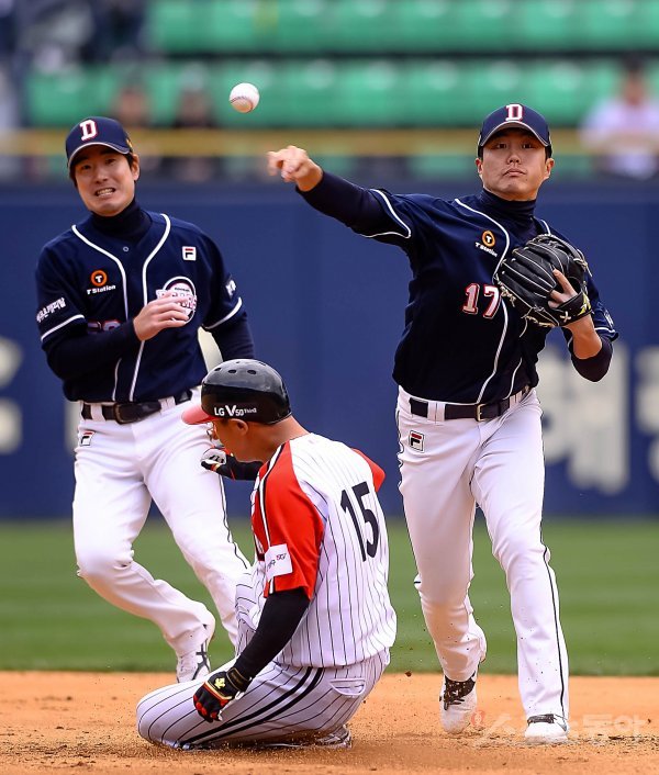 두산 2루수 류지혁이 7회말 1사 1루에서 상대 타자의 내야 땅볼 때 선행 주자를 포스아웃시킨 후 1루로 송구해 병살타를 만들고 있다.