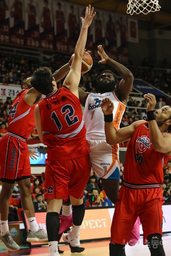 전자랜드 팟츠가 2쿼터 모비스 수비를 뚫고 레이업 슛을 하고 있다.