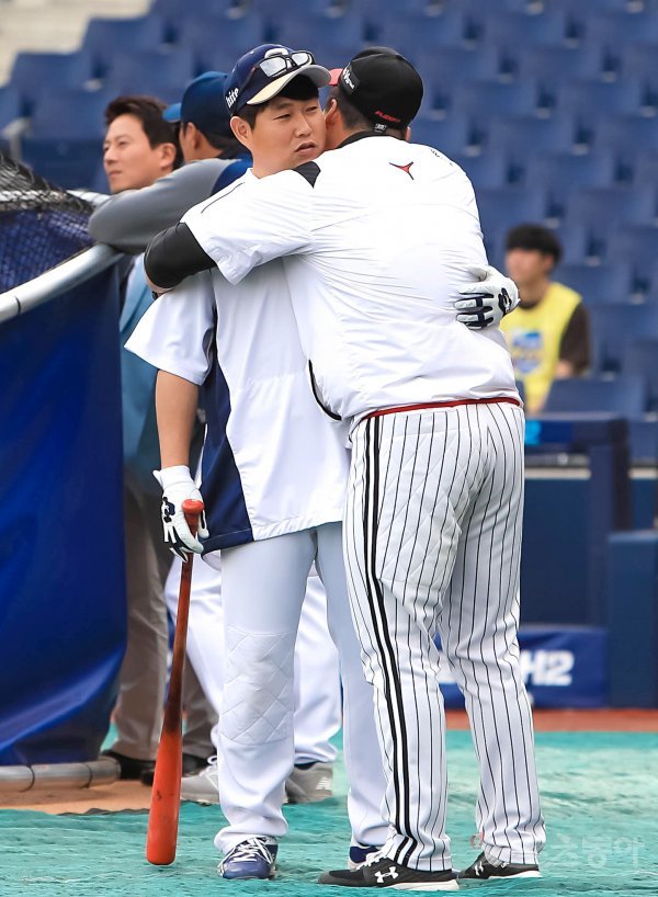 경기를 앞두고 NC 양의지가 LG 김현수(오른쪽)와 포옹을 하고 있다.