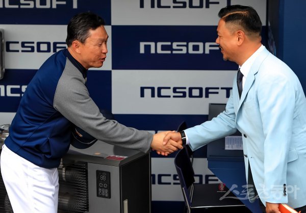 경기를 앞두고 NC 이동욱 감독이 이상훈 해설위원(오른쪽)과 악수를 나누고 있다.