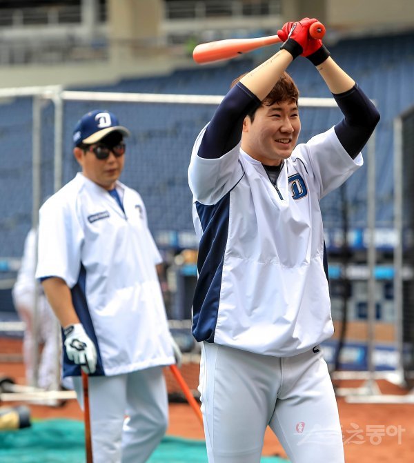 경기를 앞두고 NC 박민우가 배팅 훈련에 앞서 방망이를 휘두르며 미소를 짓고 있다.