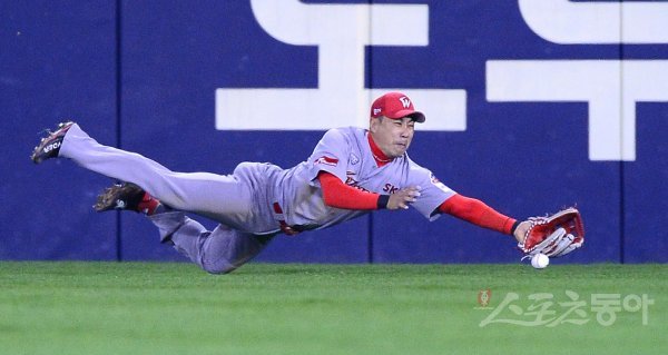 4회말 무사 SK 김강민이 두산 허경민의 타구를 다이빙캐치 시도했으나 놓치고 있다.