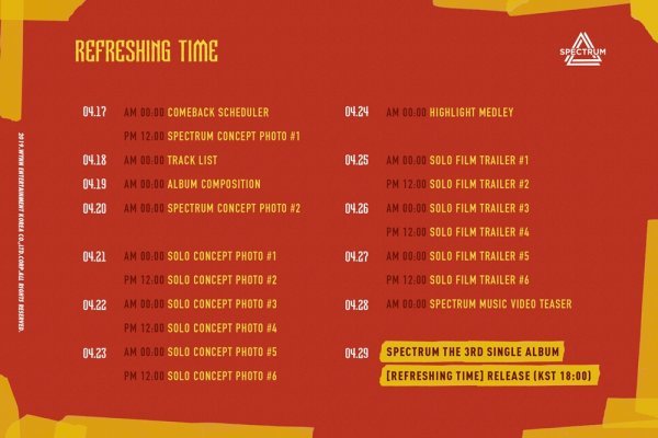 그룹 스펙트럼이 17일 0시 공식 SNS에 세 번째 앨범 \'Refreshing time\'의 프로모션 스케줄러를 업로드했다.