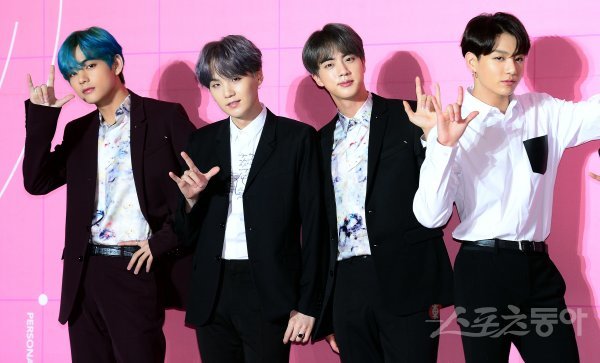 17일 서울 동대문디자인플라자에서 방탄소년단 ‘MAP OF THE SOUL : PERSONA’ 발매 글로벌 기자간담회가 열렸다. 방탄소년단 뷔, 슈가, 진, 정국이 카메라를 향해 포즈를 취하고 있다.